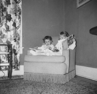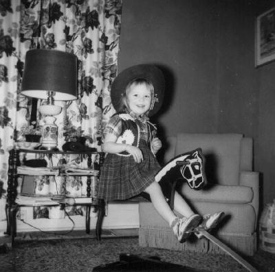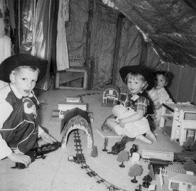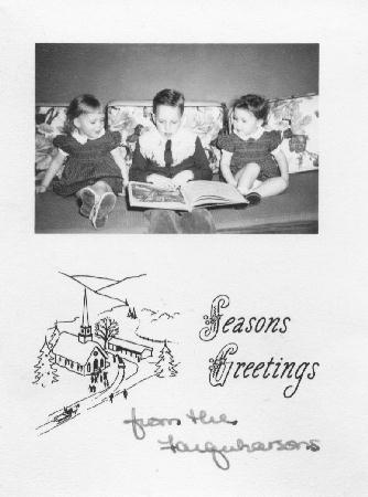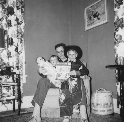 | Check the cowboy sweater, which Mom knit for me. I loved it. What do you suppose I was reading to Mary and Leigh? My guess would be Edward Lear's Nonsense Book ("I eat my peas with honey, I've done it all my life. They really do taste funny, but it keeps them on my knife."). |